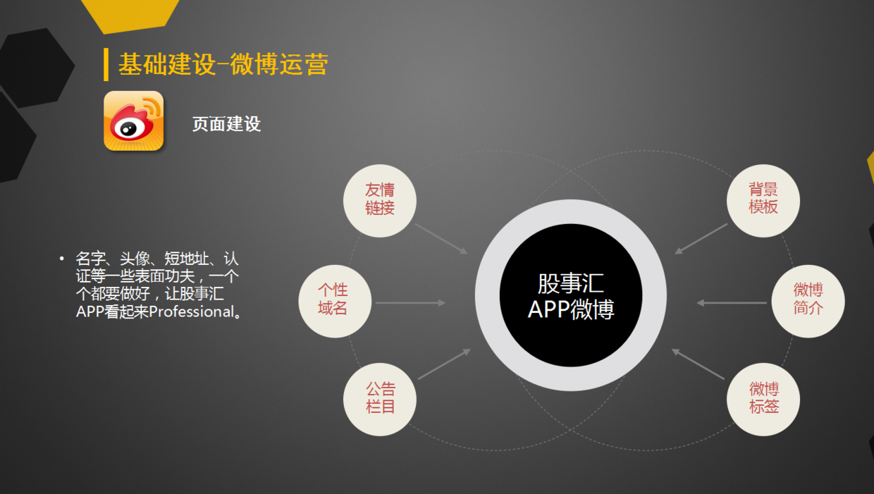 微博的運(yùn)營方案,也主要跟微信前期構(gòu)建差不多,也是有欄目規(guī)劃,頁面建設(shè)以及內(nèi)容定位等。比如在頁面建設(shè)上,你可以在名字、頭像、短地址、認(rèn)證等一些表面功夫,一個個都要做好,讓微博看起來更加Professional。