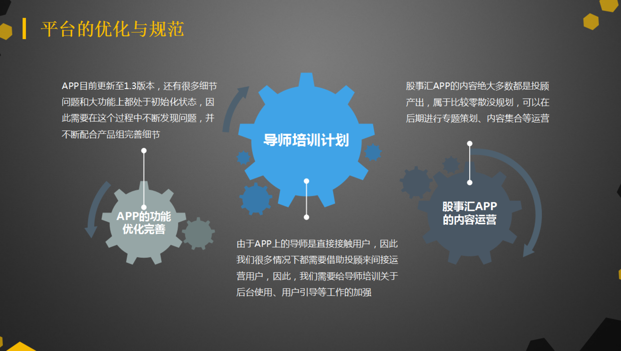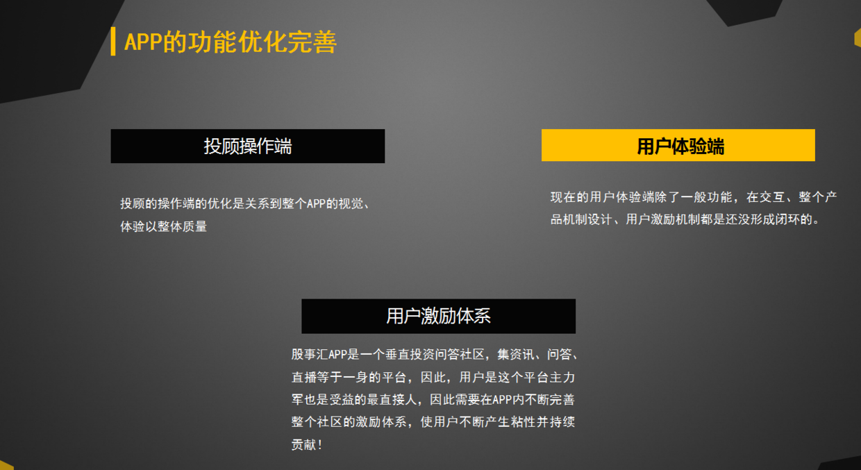 因為我們的產(chǎn)品是一款財經(jīng)資訊類的APP,所以為了能夠讓老師更加方便的錄入文章,我們需要在老師的操作端即編輯器上做個優(yōu)化,讓這個編輯器體驗更加好。還有為了能夠讓這個產(chǎn)品的留存率提高,還的用戶激勵體系上做個優(yōu)化,建立起APP一套完善的激勵體系,使用戶愿意花更多時間留在APP里面。而我們這款A(yù)PP在UI設(shè)計、交互等方面還有很大的上升空間,所以我們接下來也會在視覺交互方面優(yōu)化這款A(yù)PP。