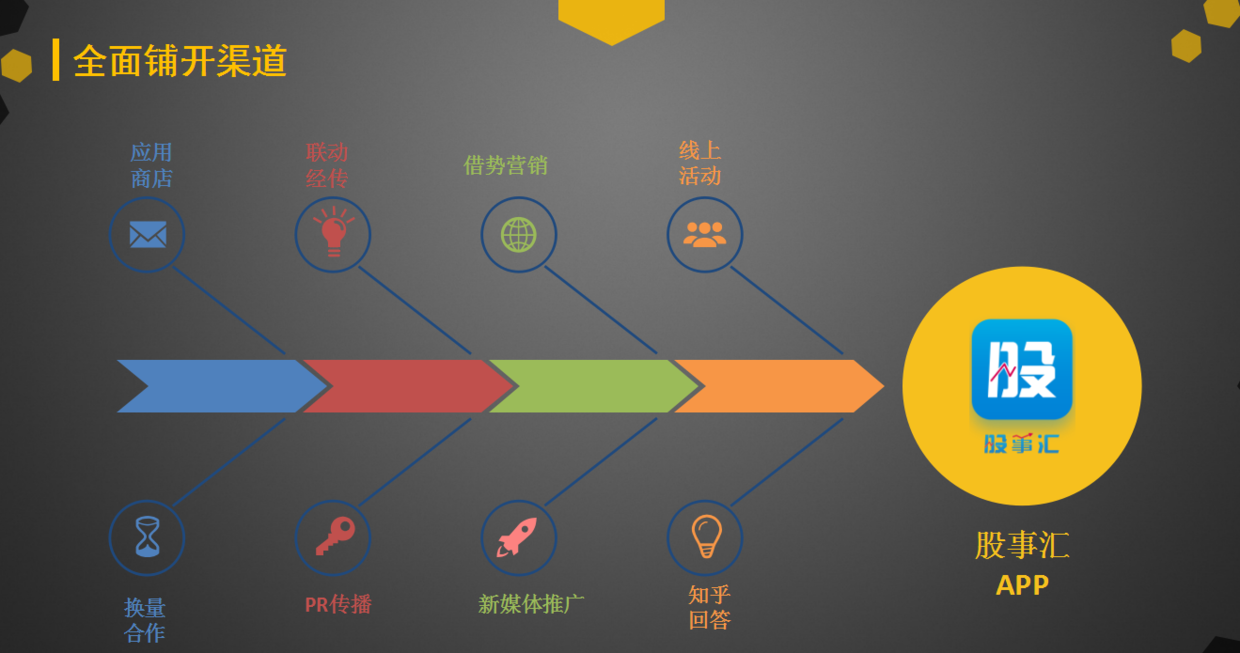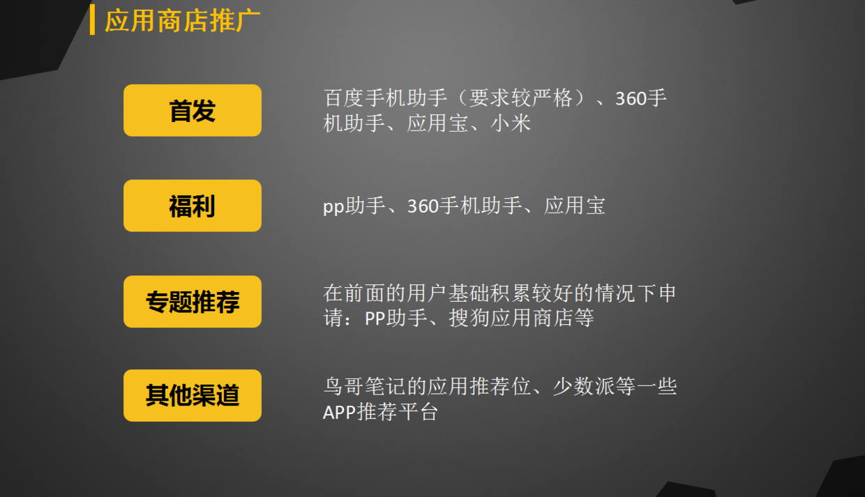 前面的全部鋪墊,都是為了能夠拉進(jìn)來的用戶更加愿意留在APP里面玩耍,渠道的鋪開說明這款A(yù)PP已經(jīng)做好準(zhǔn)備接受市場的驗證了。所以我們在第三階段應(yīng)該著重做渠道的推廣。我們主要將渠道分為了應(yīng)用商店、線上活動、換量合作、pr、傳播、新媒體推廣等。