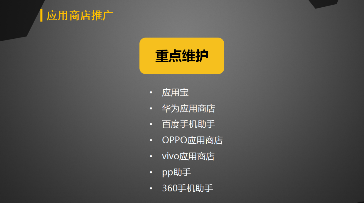 比如我們在做應(yīng)用商店這個渠道時,雖然說應(yīng)用商店有幾十個,比如以bat為代表的應(yīng)用寶、百度手機(jī)助手和pp助手,還有各手機(jī)廠商更是密集如林,比如小米、OPPO、vivo、華為等,還有第三方的安卓應(yīng)用商店、豌豆莢等。但絕不能全部都想要,要挑優(yōu)質(zhì)的,這個優(yōu)質(zhì)就是流量大,以及在推廣宣傳上可以給到更多的優(yōu)惠。后來我們就挑選了小米應(yīng)用商店、360手機(jī)助手、華為應(yīng)用商店、樂視應(yīng)用商店、魅族應(yīng)用商店、OPPO應(yīng)用商店、vivo應(yīng)用商店等來作為重點(diǎn)維護(hù)的渠道。因為在流量上以及在活動推廣上,這幾個渠道都是目前較為優(yōu)質(zhì)的。特別是現(xiàn)在的華為和OPPO手機(jī)應(yīng)用商店。