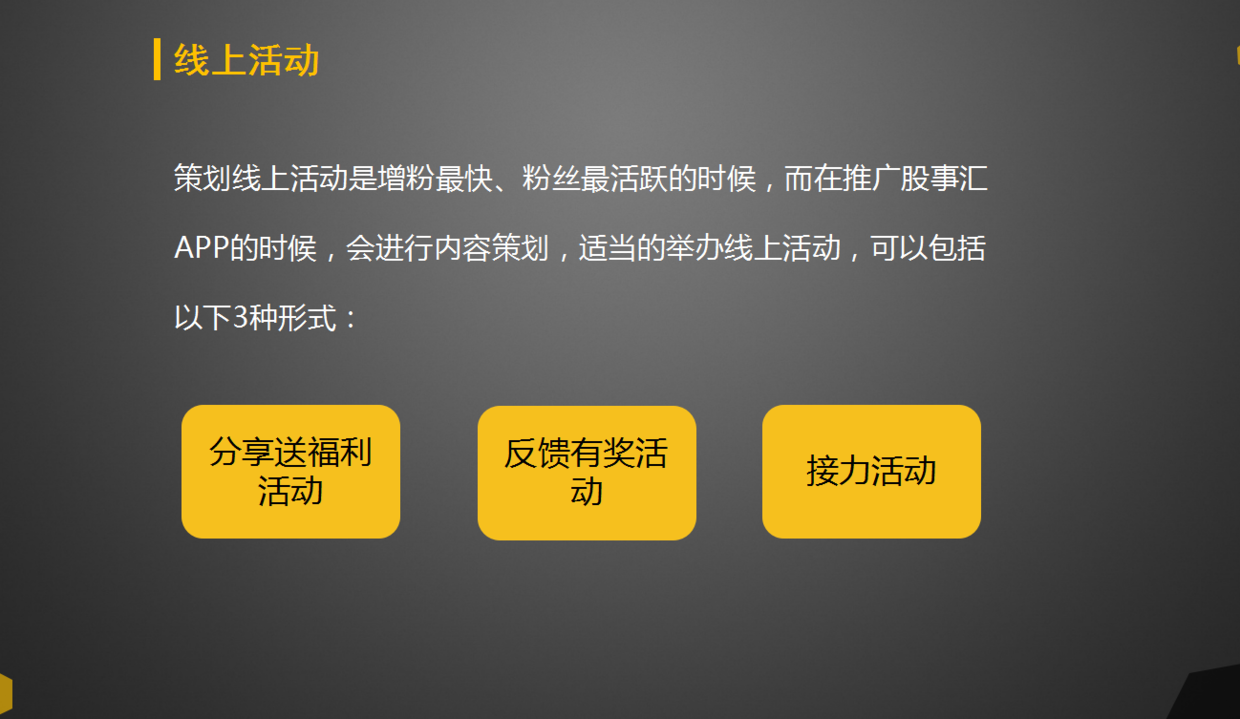 比如我將欄目規(guī)劃建設(shè):精選閱讀;學(xué)院頻道和個人中心。精選閱讀主要包括此公眾號的歷史文章、每日的多贏收評以及市場上的熱點(diǎn)深度評析文章共三個tab,而在運(yùn)營策略上主要是精選閱讀這個欄目需要每日更新最新內(nèi)容;文章屬性以趣味性+專業(yè)性結(jié)合,及時做好熱點(diǎn)營銷;在內(nèi)容產(chǎn)出這塊主要來自運(yùn)營團(tuán)隊以及財經(jīng)編輯;并配合經(jīng)傳或者股事匯的線上活動進(jìn)行優(yōu)化更新等。其他的學(xué)院頻道和個人中心也是如此,由于PPT頁數(shù)太多了,我就沒有全部貼出來,想要拿這份PPT的小伙伴可以在文章后面按提示拿這份方案。