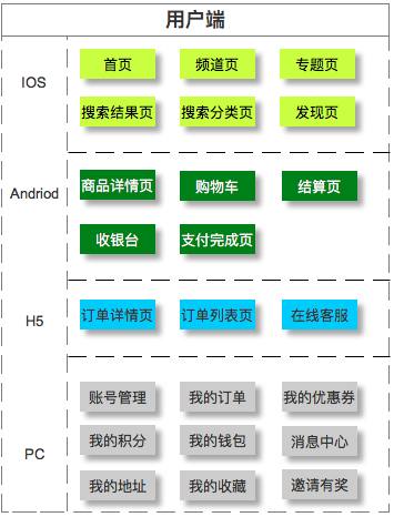 電商的用戶端主要功能是提供購(gòu)買和商品展示,并能夠協(xié)助用戶進(jìn)行個(gè)人服務(wù)管理。從用戶的階段來劃分,主要分成售前、售中、售后三個(gè)階段。其中個(gè)人信息的管理屬于貫穿整個(gè)使用過程。