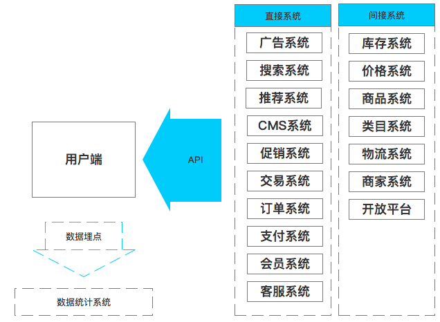 在整個(gè)電商系統(tǒng)體系里面。用戶端需要面對(duì)眾多系統(tǒng),而這些系統(tǒng)的數(shù)據(jù)又相互依存,他們之間通過API進(jìn)行傳輸對(duì)接。