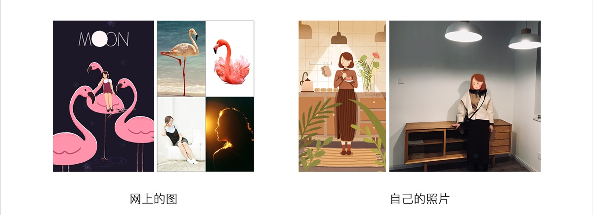把生活中的物件、故事提取歸納,自己的照片,網(wǎng)上有趣的照片,都是可以作為畫面里的元素。