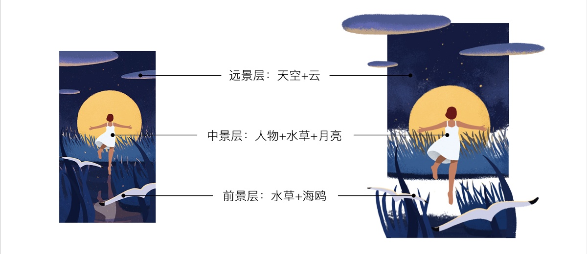 以《月夜》這幅畫來解構(gòu),為了表達(dá)主題「擁抱月光的少女」,畫面里使用了:少女、月亮、湖、水草、海鷗、天空、月光、云朵、螢火蟲等內(nèi)容。構(gòu)建了一輪落在湖邊水草叢里的月亮,奔跑著擁抱月亮的少女的小場(chǎng)景。少女和月亮是畫面主體,湖、水草、海鷗、天空、云朵構(gòu)成了故事的場(chǎng)景,螢火蟲和月光用于渲染畫面氛圍。