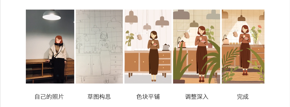 主題:《休憩時(shí)光》的主題源于我的日常生活記錄,在亦師亦友的司徒大大家里,當(dāng)時(shí)覺得柜子很喜歡,攝影師lenfer給我拍了這張照片。后來翻照片時(shí),覺得吊燈圓圓的也很可愛,一下就有了在廚房里吃著小甜點(diǎn)的畫面,于是做了草圖構(gòu)思。照片里的柜子是放在客廳,所以背景是空的。但是畫的設(shè)計(jì)是廚房吃甜點(diǎn),所以廚房的道具陳設(shè)是找了其他的真實(shí)的參考圖,以及自己想象。