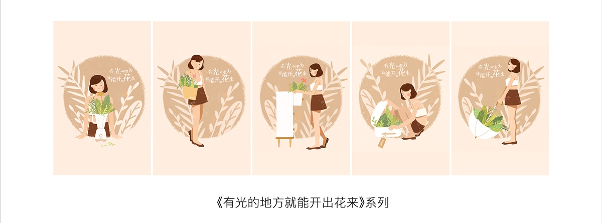 系列插畫具有相同的主題,類似的場(chǎng)景動(dòng)作,表現(xiàn)手法形式基本一致。