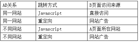 如果A頁面通過JS跳轉(zhuǎn)到B頁面,那么B的引薦來源為A所在的網(wǎng)站。當(dāng)然,對于A頁面而言,因為是通過JS跳轉(zhuǎn)又沒加載到統(tǒng)計代碼,A頁面本身的來源是無法識別的,也就是說A頁面本身的來源將歸到直接訪問,B頁面的訪問來源為A所在網(wǎng)站。