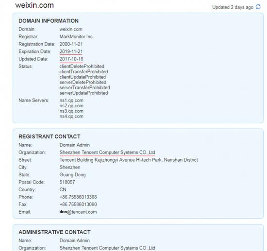但現(xiàn)在,雷鋒網(wǎng)發(fā)現(xiàn),據(jù)域名注冊信息網(wǎng)站whois的信息, weixin.com域名的所有權(quán)已經(jīng)正式屬于騰訊。域名信息的更新日期是2017年10月18日,該域名將在2019年11月21日過期。注冊和管理的聯(lián)系信息中,可以看到,公司地址和域名服務器信息等都對應換為騰訊的。雖然騰訊目前還在使用原來的二級域名,但相信不久之后,騰訊就會使用weixin.com作為官方網(wǎng)站地址。