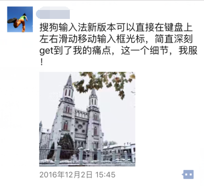 這個是前2天出現(xiàn)在皓皓的朋友圈說說,是贊美搜狗輸入法的鍵盤移動設(shè)計的,對于這種細節(jié),大家是是否有必要做呢?或許很多人都會說,沒必要呀,這個功能那么隱藏,估計沒有幾個人會用到。就像皓皓,包括皓皓現(xiàn)公司同事,都說沒必要用到這個功能。
