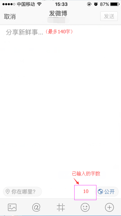 那具體怎么優(yōu)化會好點,對于這種輸入庫提示,首先是高亮提示,然后再來減少點擊。就比如微博,我們在空白時,提示可輸入多少個,然后提示還剩下/已經(jīng)輸入了多少字(對于只可輸入短文本的,就提示剩余多少字,多余可以輸入長文本的,則提示已經(jīng)輸入多少字)。那減少點擊呢,就是超過了字數(shù),就不讓用戶繼續(xù)舒服,否則還得用戶去刪除,多麻煩。