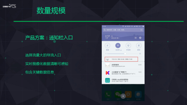 我就把它放在通知欄里,通知欄每天收到5條10條是有的,每天你會(huì)打開(kāi)看一下,我們盡量做的小一點(diǎn),我們做了處理之后左邊加上一個(gè)動(dòng)態(tài)圖標(biāo),會(huì)根據(jù)你的消耗漲和減,這樣我覺(jué)得從產(chǎn)品體驗(yàn)上盡可能做到不打擾用戶(hù)。但是我們?cè)谝粋€(gè)用戶(hù)高頻使用的入口上面強(qiáng)加了一個(gè)應(yīng)用,我們占了這個(gè)入口,肯定有一部分的用戶(hù)很反感,我又不需要你,我每個(gè)月10個(gè)G流量呢,你在這給我開(kāi)一個(gè)賣(mài)流量的入口,把這個(gè)地方看成一個(gè)商店,覺(jué)得很打擾他。那我們?cè)趺醋瞿?