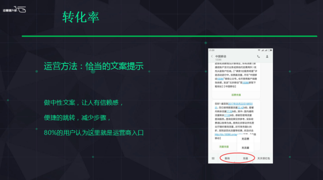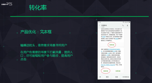 再說(shuō)轉(zhuǎn)化率問(wèn)題。我認(rèn)為剛才說(shuō)到如果我對(duì)一萬(wàn)個(gè)人去推薦,和一百個(gè)人去推薦是不一樣的。另外一個(gè)問(wèn)題是說(shuō)如果同樣對(duì)一萬(wàn)人推薦,我肯定希望最好是10%,不是1%。我們就分析這個(gè)項(xiàng)目的用戶(hù)人群,我們覺(jué)得買(mǎi)流量充值加油包的人肯定是缺流量的人,我們就分析缺流量的人在哪里?缺流量的人平常意識(shí)里面也不主動(dòng)意識(shí)自己缺流量。實(shí)際上80%意識(shí)到自己缺流量時(shí)是運(yùn)營(yíng)商給他發(fā)的短信,基本上運(yùn)營(yíng)商發(fā)短信每個(gè)月收到3到5次,當(dāng)你使用到50%、80%、90%時(shí)都會(huì)收到運(yùn)營(yíng)商的推送,會(huì)告訴你流量還剩多少。我們當(dāng)時(shí)就想,收到短信后用戶(hù)怎么辦?他肯定想我去買(mǎi)一個(gè)流量補(bǔ)充下。或者是算了,我把流量關(guān)了這個(gè)月不用了。如果去買(mǎi)流量的話,過(guò)去是去線下的充值點(diǎn),或者是找支付寶或者微信支付打開(kāi)從錢(qián)包里去買(mǎi)。這樣他還是需要兩到三步的操作體驗(yàn),我們想要做的是當(dāng)他意識(shí)到缺流量,找一個(gè)點(diǎn)充值的環(huán)境把這部分人攔下來(lái)提供我們的服務(wù),這樣就在你收到的短信上面收到一個(gè)文本框,這個(gè)文本框每條短信收到后出現(xiàn)四個(gè)字流量充值,只要用戶(hù)一點(diǎn)就可以進(jìn)行充值成功,這樣少兩到三個(gè)步驟。