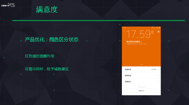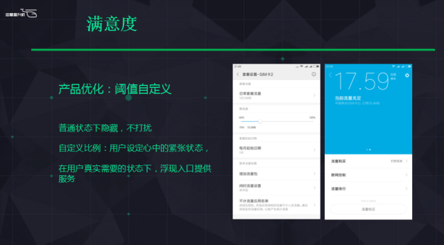 這里面有個(gè)比較重要的數(shù)字是說(shuō),在左邊圖下面看到一個(gè)設(shè)置60%到100%之間,我覺(jué)得有些朋友是比較粗線條的,他覺(jué)得這個(gè)東西不太重要盡量不要打擾我,他可以設(shè)置到10%。有些用戶(hù)是說(shuō)我比較在乎,每個(gè)月的流量也不多,緊接著就可以設(shè)定。這個(gè)極限值相當(dāng)于是用戶(hù)自己去設(shè)定心中的目標(biāo),這樣比較靈活,比較能夠配合他,不會(huì)過(guò)早提示他,也不會(huì)太晚提示他。因?yàn)樘崾舅臅r(shí)機(jī)正好是他需要的時(shí)機(jī),這是我們基于用戶(hù)場(chǎng)景做的細(xì)節(jié)。