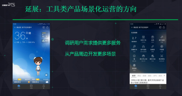 我在主要負(fù)責(zé)工具運(yùn)營(yíng)之前,也分析了很多行業(yè)里面基于產(chǎn)品場(chǎng)景+運(yùn)營(yíng)場(chǎng)景的一些工作。比如剛才一開(kāi)始我在海龜那張圖時(shí)給大家埋了一個(gè)伏筆,計(jì)算器、導(dǎo)航、指南針這些東西覺(jué)得不需要運(yùn)營(yíng),其實(shí)這句話到今天來(lái)講有點(diǎn)問(wèn)題,做一個(gè)產(chǎn)品肯定是有商業(yè)目的的。除了一些狂熱愛(ài)好者和發(fā)燒友做產(chǎn)品以外,一般的產(chǎn)品公司都有自己的商業(yè)目的,那就是怎么去盈利?開(kāi)辟盈利場(chǎng)景?比如說(shuō)計(jì)算器可以算社保,算五險(xiǎn)一金,算房貸。這個(gè)背后的邏輯是說(shuō),既然你算房貸,我可以給你提供貸款,算五險(xiǎn)一金我可以給你提供理財(cái)服務(wù),算一算一年之后的收益,通過(guò)這些場(chǎng)景來(lái)轉(zhuǎn)化一些廣告。