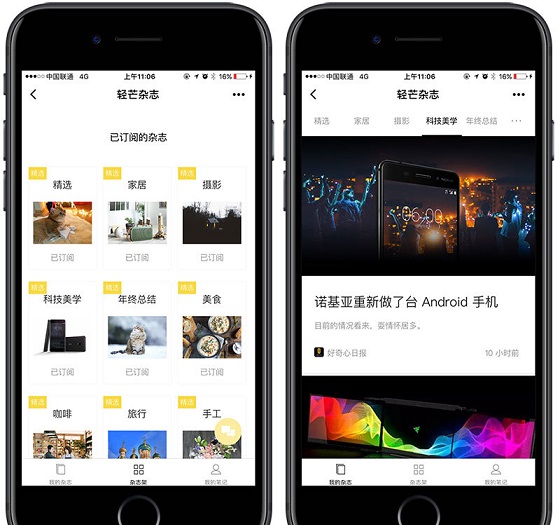 「輕芒雜志小程序」保持了輕芒雜志 app 特有的全面、細(xì)分的興趣,以及雜志版輕松有趣的閱讀體驗(yàn)。同時(shí)它也充分展現(xiàn)了小程序的特點(diǎn),無(wú)需安裝、觸手可及、用完即走、無(wú)須卸載。