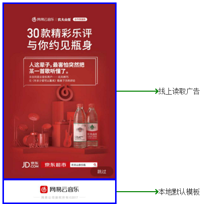 網(wǎng)易云音樂(lè)的啟動(dòng)頁(yè)樣式如上圖,下方的是本地默認(rèn)模板,在用戶下載apk包的時(shí)候自帶的。上方的組件是線上讀取廣告,從線上讀取廣告之后,緩存在本地中,每次啟動(dòng)app的時(shí)候展示出來(lái),下次再次啟動(dòng)app的時(shí)候,先向服務(wù)器調(diào)取參數(shù),看看線上有沒(méi)有更新廣告,如果有更新,則需要下載最新一版的,如果沒(méi)有更新,則展示本地緩存的廣告。