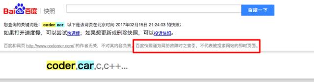 首先,讓我們先為入門站長普及一下快照的基本概念,例如搜索『codercar.com』出來的百度快照截圖,請注意紅框部分的描述:
