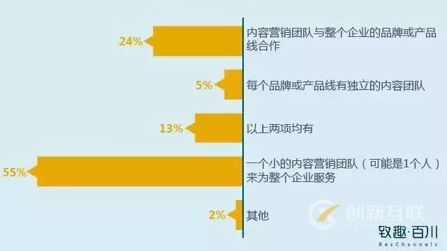 cmi發(fā)現(xiàn),在北美 98%的 b2b公司,都開(kāi)始有專業(yè)的b2b內(nèi)容團(tuán)隊(duì)來(lái)為整個(gè)企業(yè)服務(wù);24%的企業(yè),內(nèi)容營(yíng)銷團(tuán)隊(duì)與整個(gè)企業(yè)的品牌或產(chǎn)品合作;甚至還有5%的公司,每個(gè)品牌或產(chǎn)品均有獨(dú)立的內(nèi)容團(tuán)隊(duì)。當(dāng)然還有13%的企業(yè),不僅集團(tuán)層面,而且每個(gè)品牌貨產(chǎn)品線也有內(nèi)容團(tuán)隊(duì)配置。
