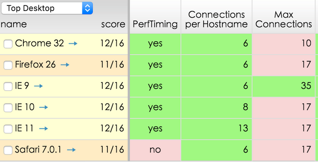 上圖展現(xiàn)了各瀏覽器的并行銜接數(shù)(同域名),能夠看到在一些現(xiàn)代瀏覽器內(nèi)每個 hostname 的大銜接數(shù)根本都是6個,IE 稍顯傲嬌,總體而言并發(fā)數(shù)不高。 所以 PC 年代對靜態(tài)資本優(yōu)化時,通常將靜態(tài)資本散布在幾個不一樣域,確保資本最好地分域名存儲,以供給大并行度,讓客戶端加載靜態(tài)資本更為敏捷。
