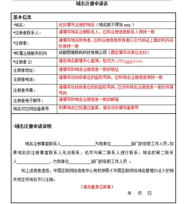 注冊及填寫申請表時注意:要求注冊時填寫的注冊單位名稱與機構(gòu)代碼證名稱、公章名稱、申請表上填寫的單位名稱完全一致,GOV域名只能由政府機關(guān)注冊,其他機構(gòu)一律不得注冊GOV域名!違規(guī)注冊將直接刪除不退款。