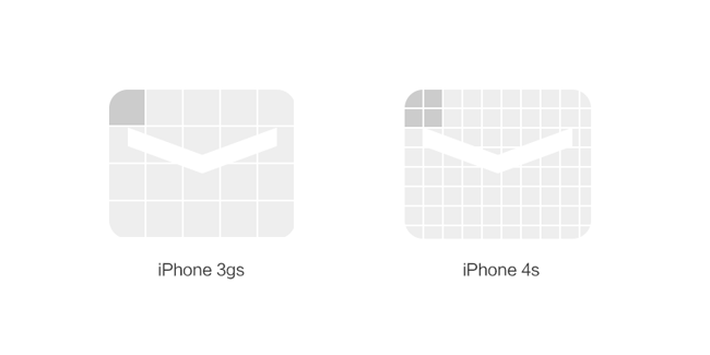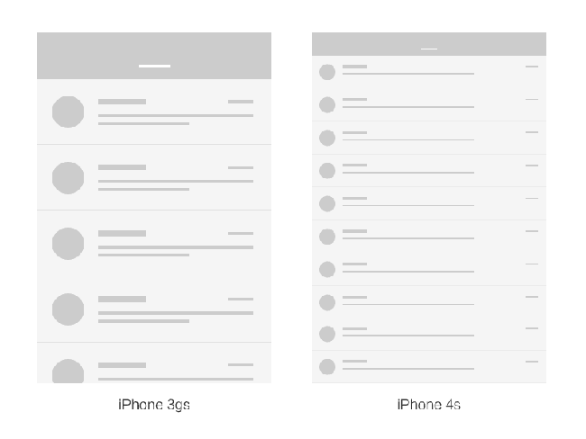 再用iPhone 3gs和4s來舉例。假設有個郵件列表界面,我們不妨按照PC端網(wǎng)頁設計的思維來想象。3gs上大概只能顯示4-5行,4s就能顯示9-10行,而且每行會變得特別寬。但兩款手機其實是一樣大的。如果照這種方式顯示,3gs上剛剛好的效果,在4s上就會小到根本看不清字。