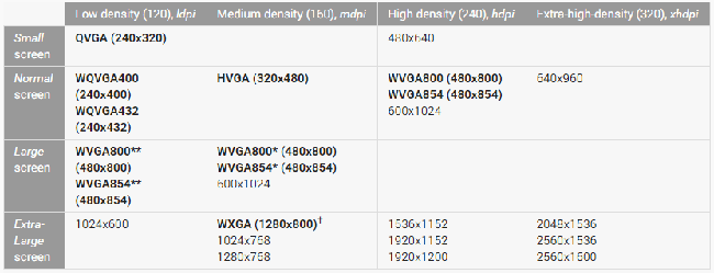 如圖所示,像素密度在120左右的屏幕歸為ldpi,160左右的歸為mdpi,以此類推。這樣,所有的Android屏幕都找到了自己的位置,并賦予了相應的倍率: