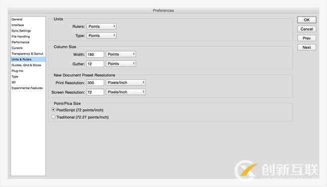 之前我說過,我們要以邏輯像素尺寸來思考界面。體現(xiàn)到設計過程中,就是要把單位設置成邏輯像素。打開PS的選項——單位與標尺界面,把尺寸和文字單位都改成點(Point)。這里的點也就是pt,無論設計iOS、Android還是Web應用,單位都用它。當然,各平臺單位名稱還是要記住的。這里我們用的只是它的原理,不用在意名稱。