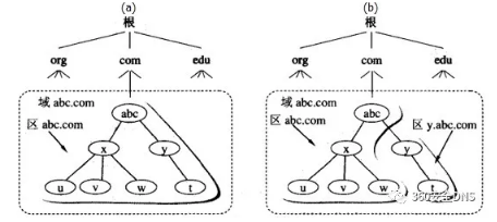如果采用(b)的方式,那么abc節(jié)點(diǎn)以下的字?jǐn)?shù)分成了兩個(gè)區(qū):x節(jié)點(diǎn)以下的部分的子樹(shù)和y節(jié)點(diǎn)以下的子樹(shù),這兩棵子樹(shù)分別有x和y對(duì)應(yīng)的域名服務(wù)器管理,就好像http://abc.com是一個(gè)福建省,x是福州市,y是廈門(mén)市,福建省的省長(zhǎng)只管理福州市和廈門(mén)市的市長(zhǎng),但不會(huì)直接管理福州市和廈門(mén)市以下的單位。福州市和廈門(mén)市以下的單位分別給福州市市長(zhǎng)和廈門(mén)市市長(zhǎng)來(lái)管轄。