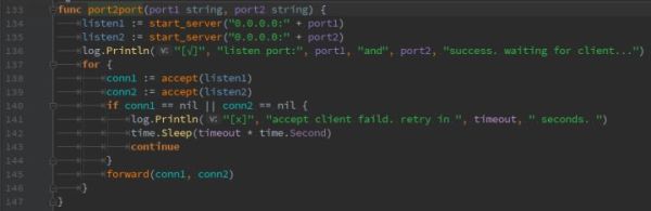 通過port2port函數(shù)實現(xiàn)了兩個端口同時監(jiān)聽雙向并且轉(zhuǎn)發(fā)數(shù)據(jù)。