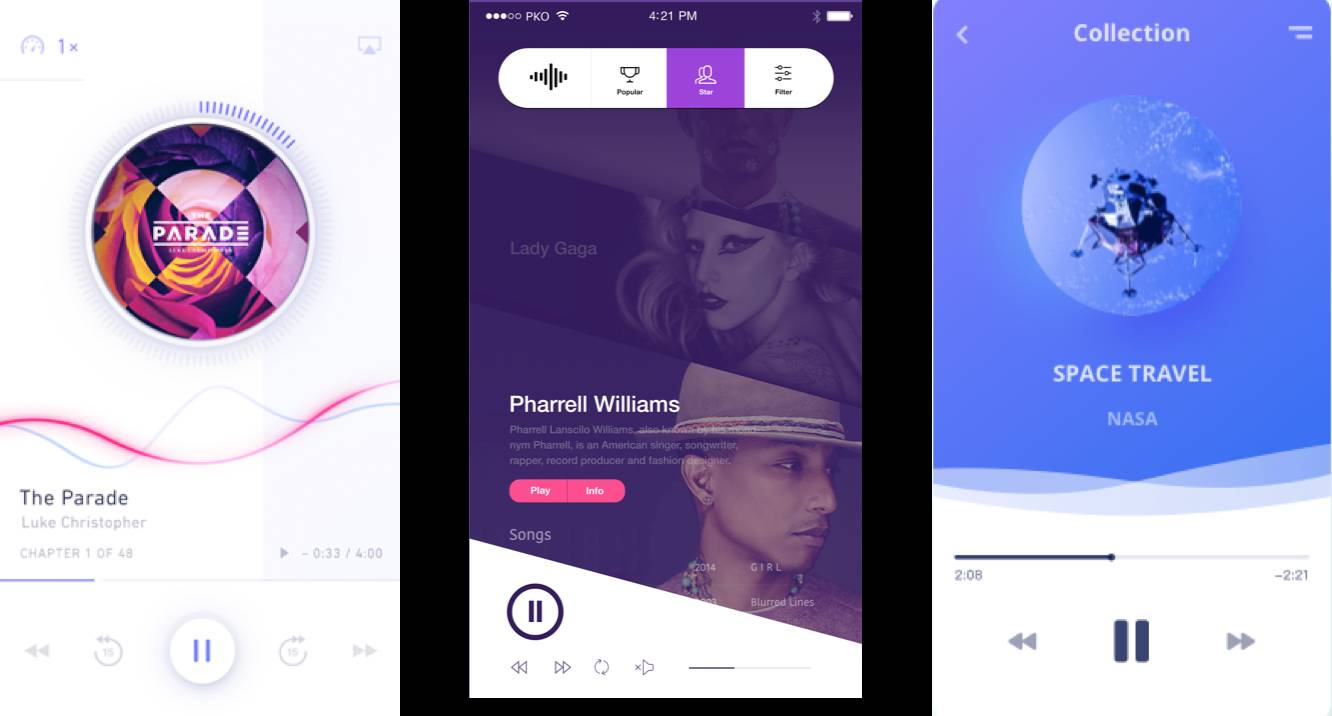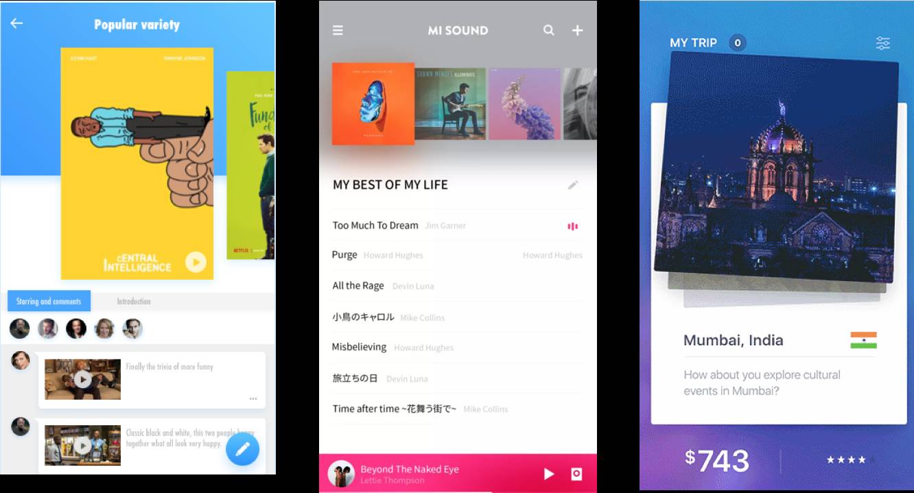 簡析:圖1在書籍封面上采用封面和背景,和消息留這種視覺錯(cuò)差營造布局空間感,圖2,大的專輯封面長圖和背景很好的融合,圖3,卡片滑動(dòng)時(shí)候的層疊效果。