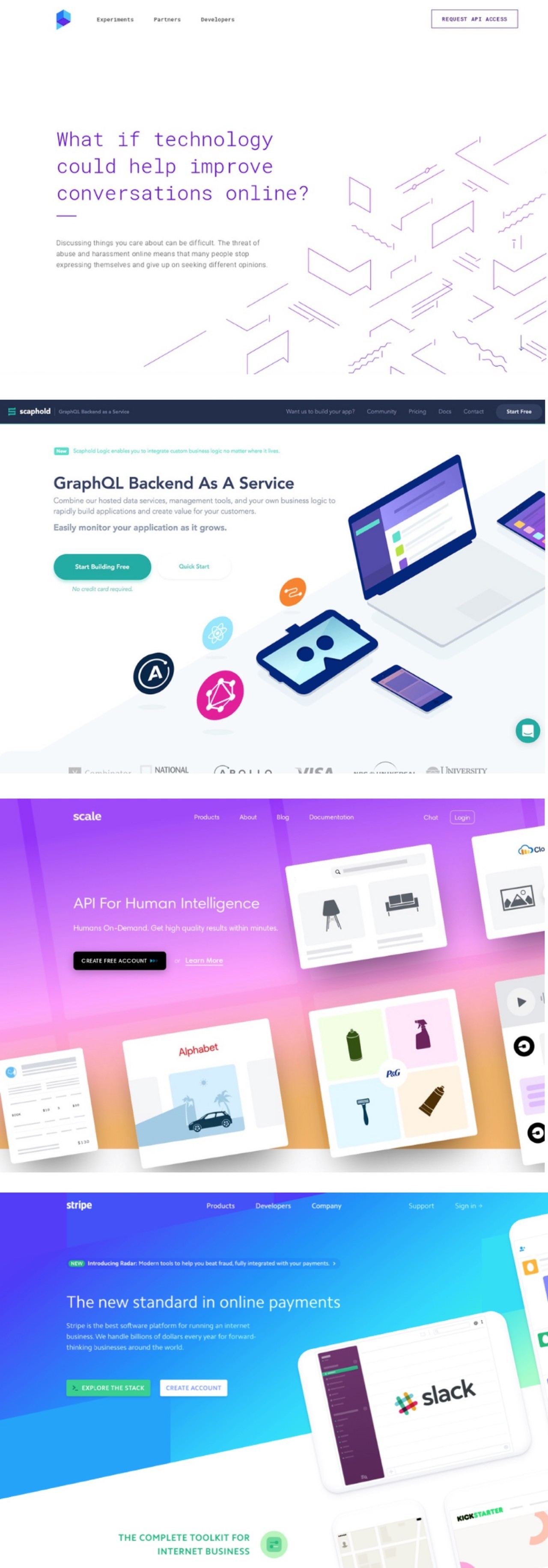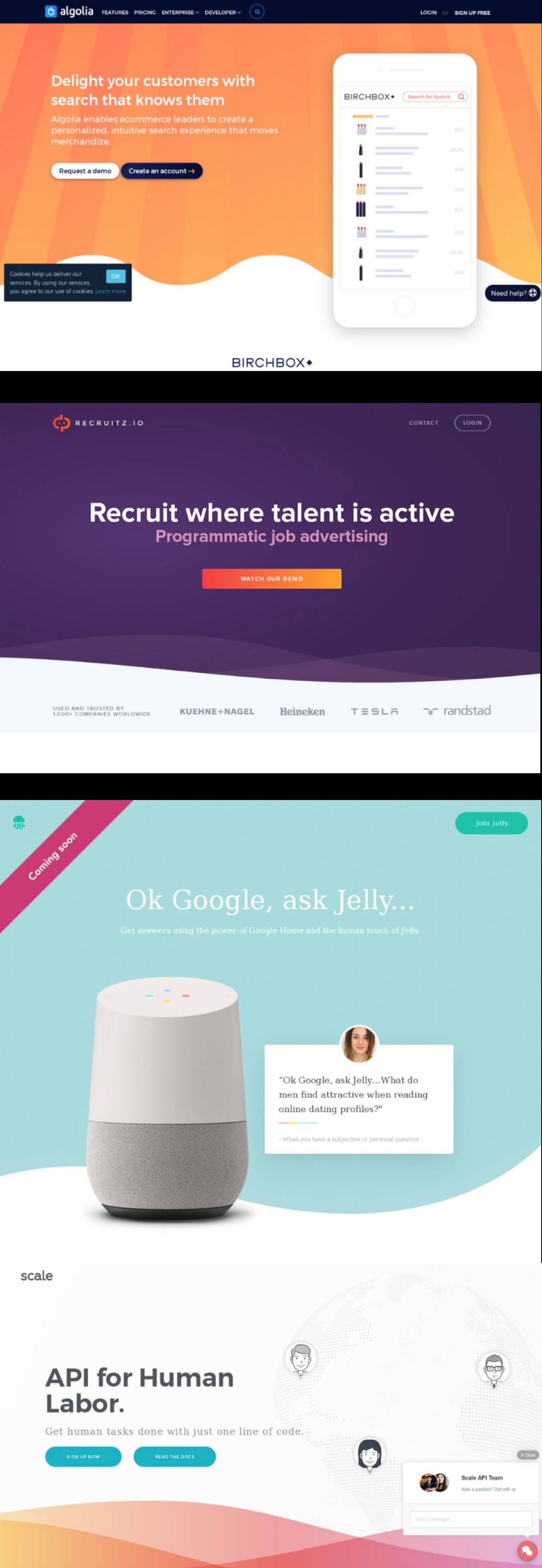17年在很多新的設(shè)計(jì)趨勢里面有種風(fēng)格,一般常在頁面頭部才用不規(guī)則弧線幾何圖形的形式作為頭部主視覺,區(qū)別于傳統(tǒng)長方形,形成設(shè)計(jì)差異性,同時(shí)在不規(guī)則弧線處理上常用和頭圖或者插畫進(jìn)行結(jié)合,有時(shí)候也會(huì)采用線條形式出現(xiàn)。