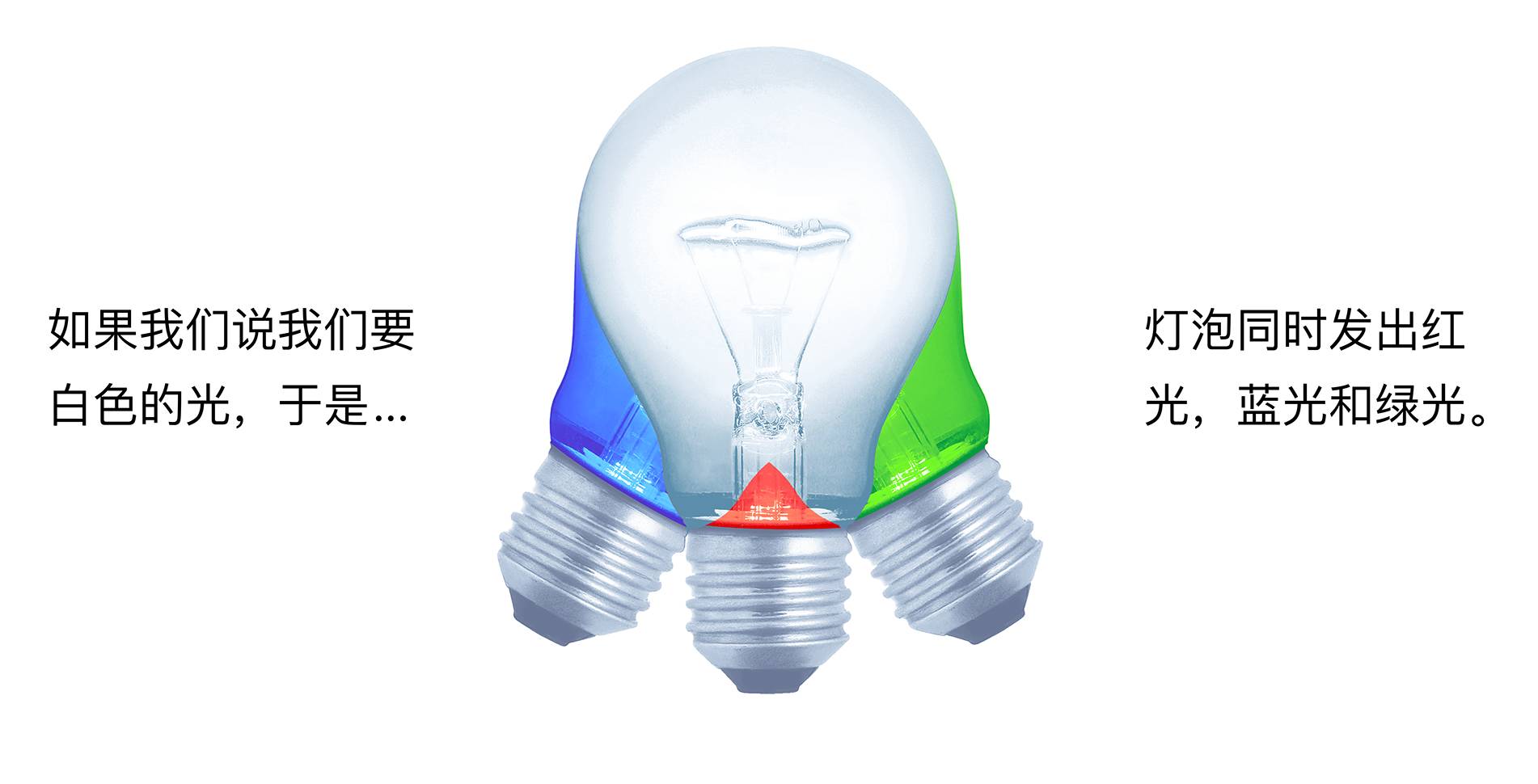所以這就是我們所謂的加色構(gòu)成中所提到的R紅,G綠,B藍(lán)三色相加為白色的由來。