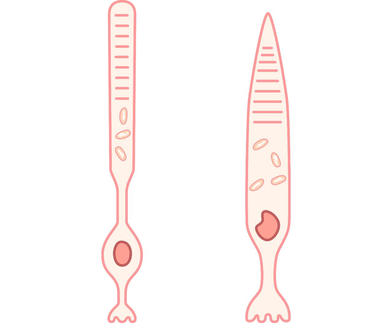 這兩個奇怪的形狀就是我們眼部視網(wǎng)膜上的視覺細(xì)胞,左邊這個長長的圓柱體叫“柱形細(xì)胞”,它是專門負(fù)責(zé)感知外部世界的明度的,而右邊的“錐狀細(xì)胞”則是感知色彩的色相的,自然它對于RGB的色彩接收是最敏感的。