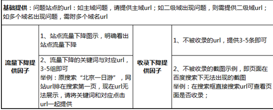 2、站點(diǎn)收錄下降,需提供單條未被百度收錄的url,同時(shí)附加未被收錄截圖,url提供3-5條即可;
