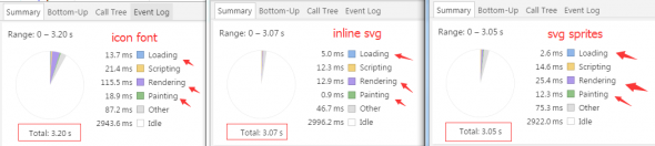Rendering 的渲染結(jié)果和之前差不多,icon font所用時(shí)間依舊比svg icon要多很多,但是inline svg和svg sprite兩種不同用法之間的差異卻變得非常小,幾乎 Rendering 的時(shí)間是差不多的。