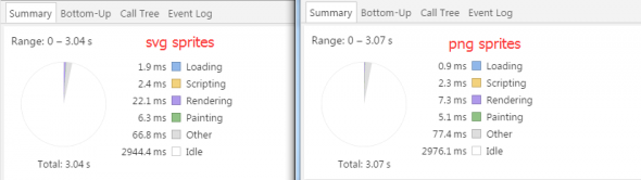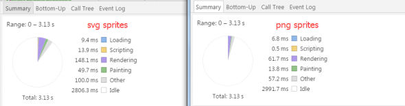 文件大小svg sprites與png sprites差不多, Rendering 也比圖片要長(zhǎng)很多,但最終兩者之間綜合所消耗時(shí)間差不多