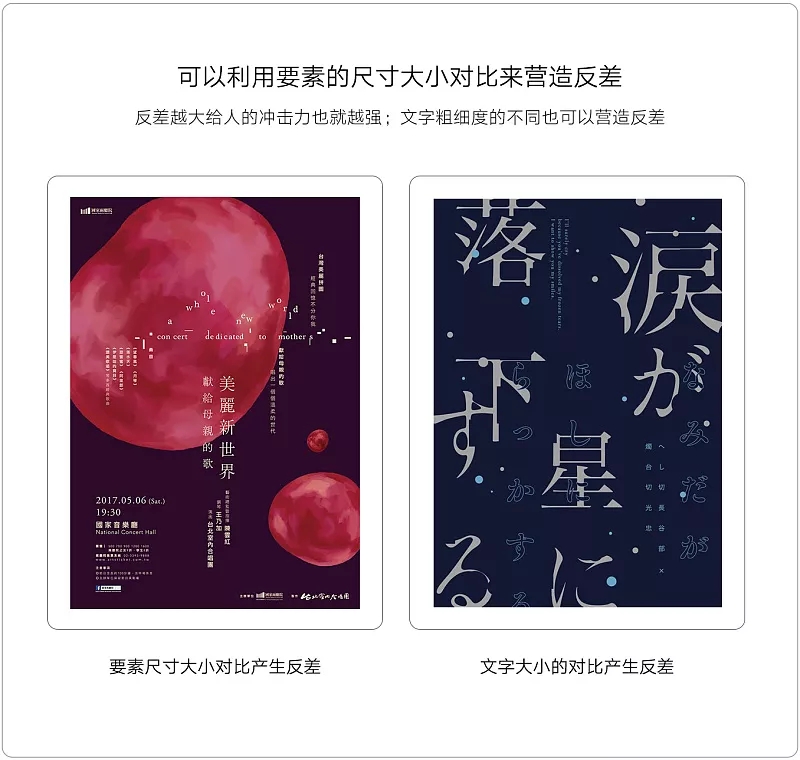 也可以利用要素的尺寸大小對比來營造反差。在設(shè)計文字時,即便是同樣的字形,筆畫粗的字感覺更硬,筆畫細(xì)的字感覺更柔,兩者搭配使用就能營造出反差。上面中“字形”是專業(yè)術(shù)語,我打算把網(wǎng)格講完就講一下字體這塊(中/日/英字體結(jié)構(gòu)與差別)。