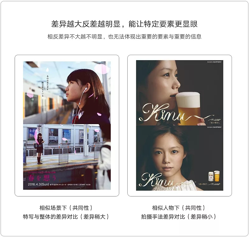 反差指的是多個要素之間的差異。通常設(shè)計師在給客戶提供設(shè)計稿時,會被客戶懟著說:這兩稿有什么差別么。其實客戶認(rèn)知中的這個“差別”就是反差的意思。差異越大反差越明顯,能讓特定要素更顯眼,相反差異不大越不明顯,也無法體現(xiàn)出重要的要素與重要的信息,就不會給讀者一種強(qiáng)烈的印象。