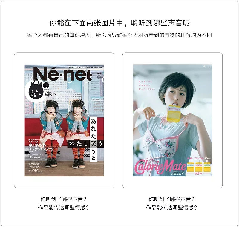 把平面設(shè)計可以比作音樂,這個又涉及到另一個知識點了,那就是聆聽作品中的“聲音”。這屬于高階設(shè)計方法上層的高階設(shè)計思維了。意思是優(yōu)秀的設(shè)計作品能傳達(dá)出它所表達(dá)的“聲音”和“語言”,這里就不多說了,如果很想了解這塊的知識,建議讀一下迪耶?薩迪奇的《設(shè)計的語言》。