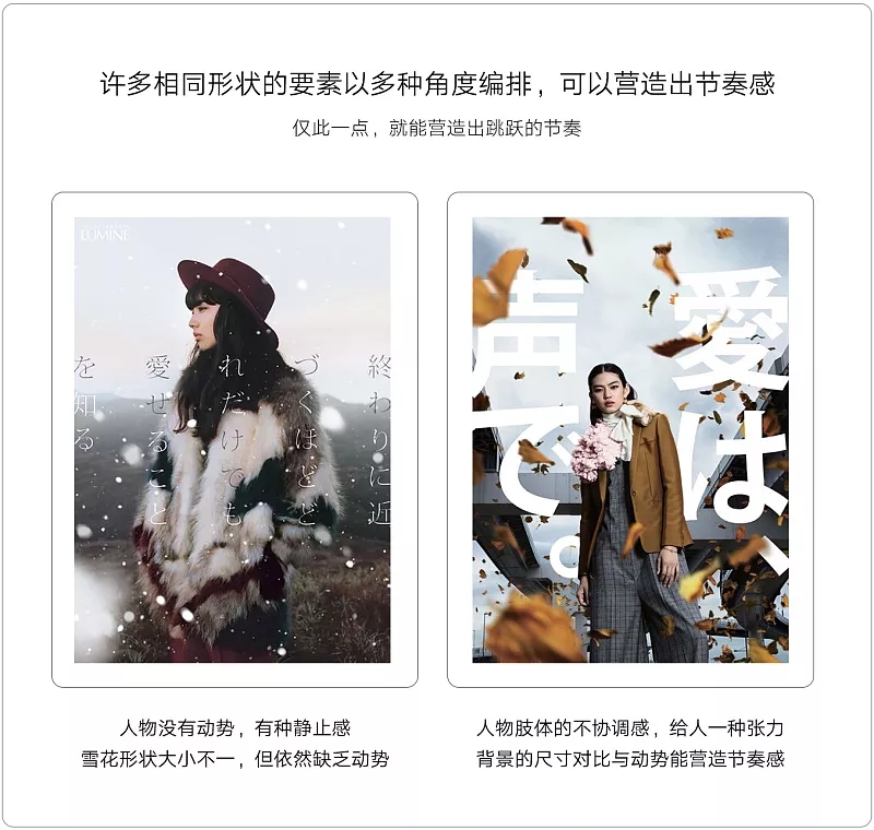 將同樣形狀的要素統(tǒng)一編排不能產(chǎn)生節(jié)奏。在大多數(shù)商品的圖片或是文章中,都很難在圖片的角度上做變化,這時若在背景上追加賦有節(jié)奏的形狀會讓整個版面具有節(jié)奏感。
