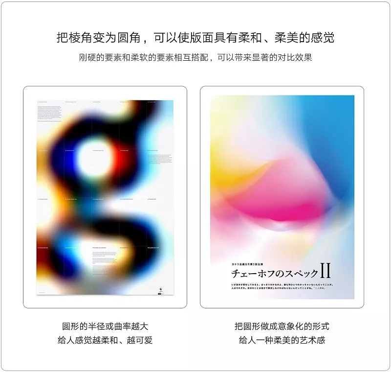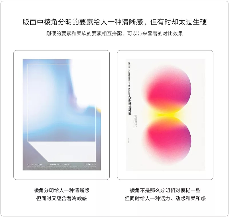 若想讓版面給人一種柔美或柔和的感覺,可以在整體上把有棱角的四方形改變?yōu)槿岷偷那€或圓角。設(shè)置圓角時,圓形的半徑或曲率越大,給人感覺越柔和、越可愛。這里又涉及到一個高階知識點-娃娃臉偏見,大致意思是成人有棱角的臉型給人感覺冷峻堅毅,嬰兒的娃娃臉給人感覺可愛溫和,如果成人長了個娃娃臉就代表知性。這個高階知識點以后會跟激活空間一起講的。
