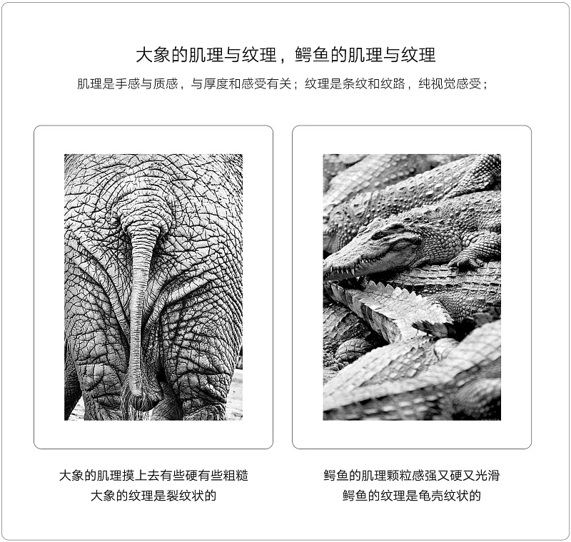 “肌理”是指物體的表面結(jié)構(gòu),與質(zhì)感的意思相近。“紋理”指的是物體的紋路,物體的花紋與條紋。舉個例子吧,肌理就像豹子身上的毛發(fā),美洲豹和雪豹身上毛發(fā)觸感是不同的,有可能一個更厚更硬一些而另一個更柔軟一些。紋理就像美洲豹和雪豹身上的紋路,雖然都是圓形狀的,但各自的紋路組成與分布是不同的。如果還是不理解的話,我就要考慮以后寫一篇關(guān)于肌理和紋理的文章了。