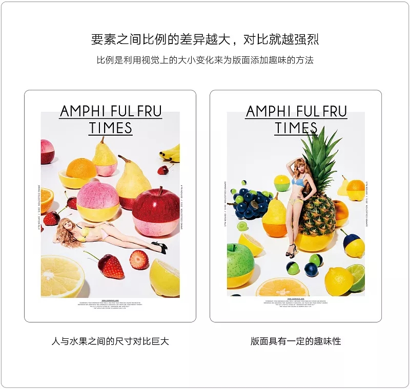 所謂“比例”指的就是尺寸大小的對比,要素之間比例的差異越大,對比就越強(qiáng)烈,給人的沖擊感也就越強(qiáng)。這里的比例單純指的是平面設(shè)計中的比例,也就是利用視覺上的大小變化來為版面添加趣味的方法。