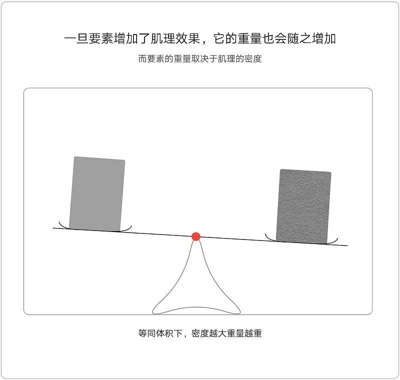 但一定要注意,一旦要素增加了肌理效果,它的重量也會隨之增加,而要素的重量取決于肌理的密度。這里不知道大家好不好理解,舉個例子。把要素想象成空玻璃杯,把肌理想象成裝進(jìn)玻璃杯的液體。現(xiàn)在把兩個空玻璃杯分別倒入液體汞和汽油,并放在天秤上,裝有汞的玻璃杯就會更重一些,汞的密度是13.546×103kg/m3 > 汽油的密度0.71×103kg/m3。所以液體的密度決定了重量,要素也一樣,肌理的密度決定了要素的重量。