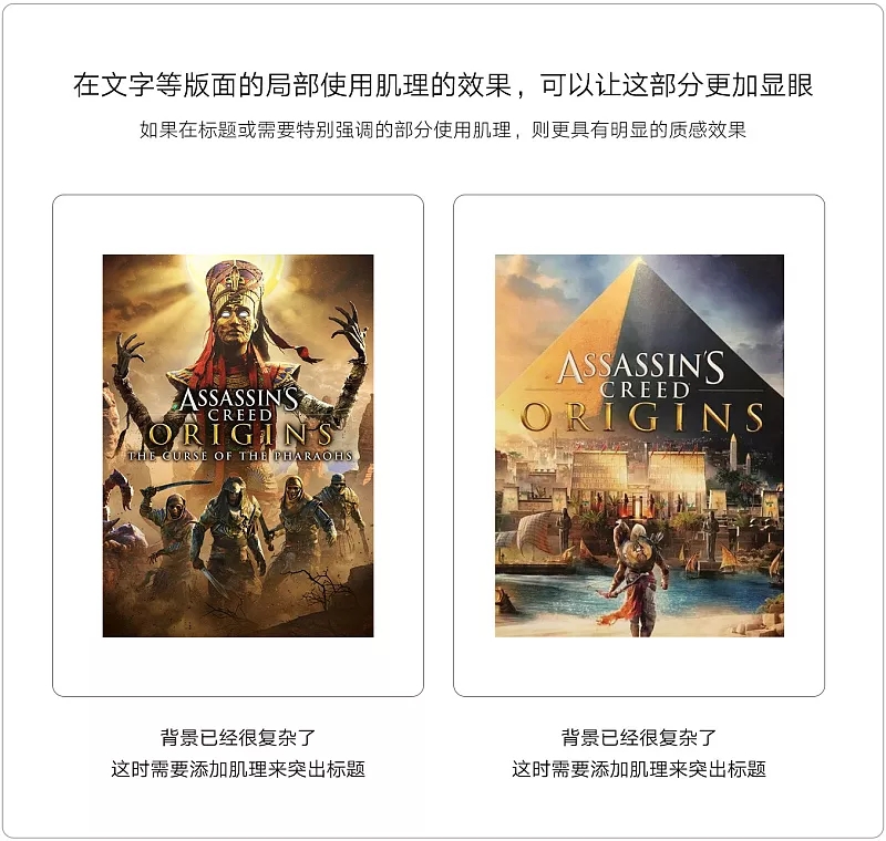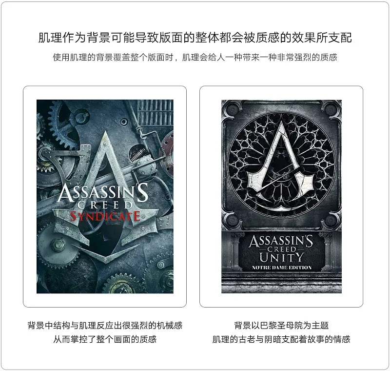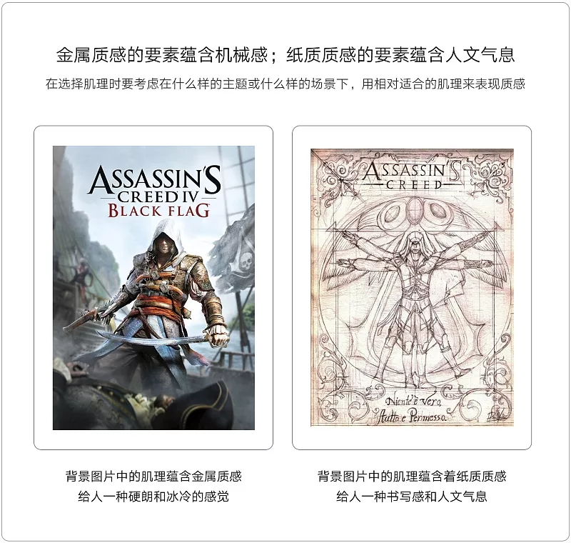 如果使用金屬質(zhì)感的要素,會給人一種強(qiáng)烈的硬質(zhì)感和冰冷感(其實就是器械感);如果使用紙質(zhì)質(zhì)感的要素,會給人一種書寫感和傳統(tǒng)感(人文氣息)。所以在選擇肌理時要考慮在什么樣的主題或什么樣的場景下,用相對適合的肌理來表現(xiàn)質(zhì)感。