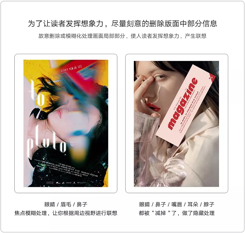 為了讓讀者發(fā)揮想象力,需要運(yùn)用減法邏輯,刻意的刪除版面中部分信息。這里又涉及到一個設(shè)計心理學(xué)的知識點-周邊視野。設(shè)計師通常只關(guān)注讀者的視覺焦點,而忽略周邊視野。