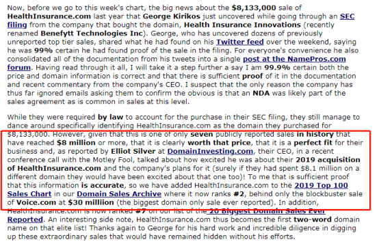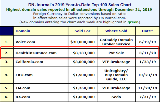 近日,DN榜證實,前段時間昵稱為GeorgeK的用戶所爆料的healthlnsurance.com交易價格可能超過800萬美元消息為真,并把這個價格列入了2019年銷售排行榜前100的榜單中。