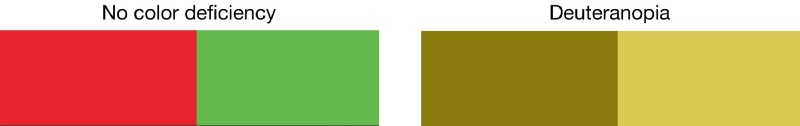 必須承認,同樣的色彩,不同的人所看到的是不一樣的。大約有8%的男性和0.5%的女性是色盲,而色弱的用戶也不在少數(shù)。紅綠色盲是最常見也是占比最多的視覺障礙者,所以,盡量避免將這兩種色彩搭配到一起,至少不要用作關(guān)鍵的信息用色,這樣能規(guī)避不少問題。