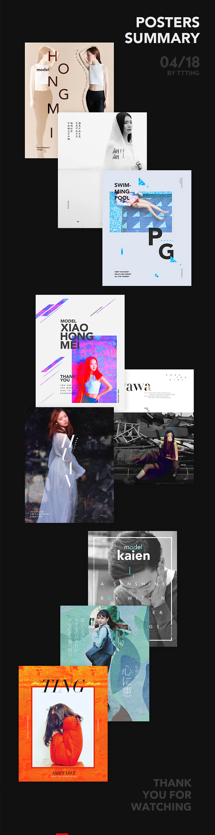 (3)從裝飾的角度出發(fā),數(shù)字可以作為點(diǎn)綴元素出現(xiàn)其實(shí)在很多時(shí)候,無(wú)論是文字還是數(shù)字等都只是一種點(diǎn)綴元素而已,最常見的就是在海報(bào)設(shè)計(jì)里的運(yùn)用咯,比如像我之前給我拍的那些模特做的一些照片海報(bào),可以說里面的所有元素都只是點(diǎn)綴而已,里面我寫的一些日期數(shù)字其實(shí)都只是點(diǎn)綴而已,對(duì)我來(lái)說并不太重要,因?yàn)槲业闹攸c(diǎn)是模特展示以及我對(duì)整體畫面情緒的表達(dá)。